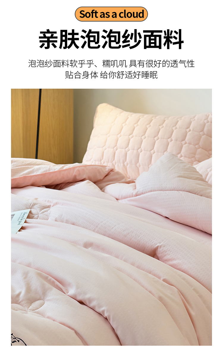 亲肤泡泡纱面料,具有很好的透气性,贴合身体,让你舒适好睡眠