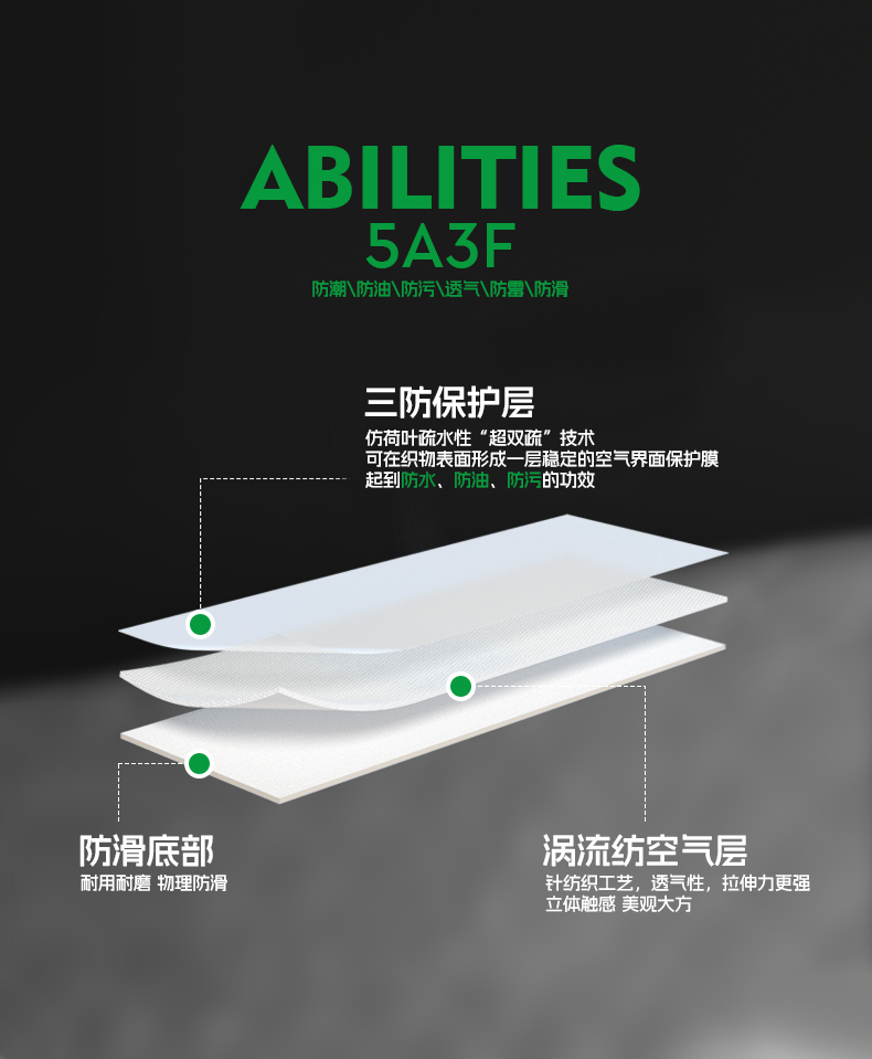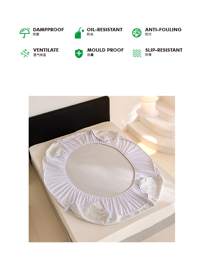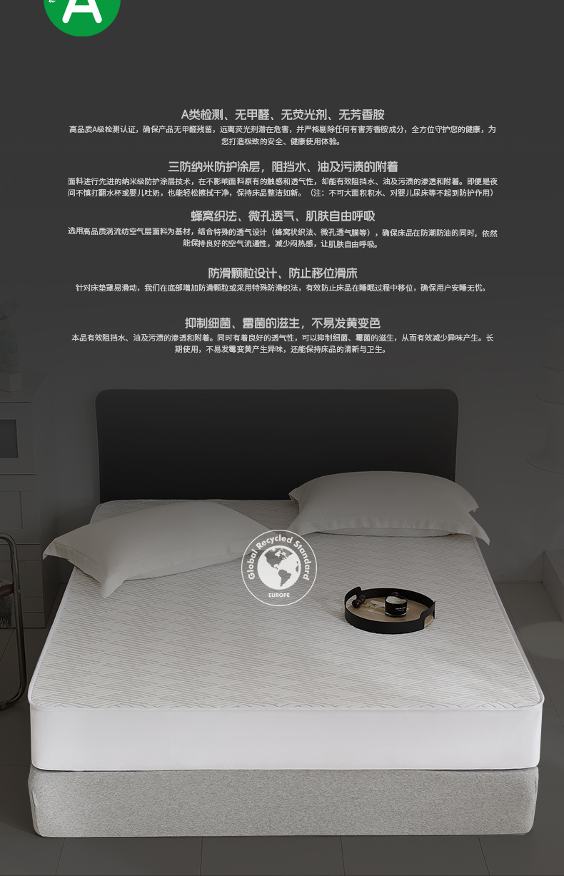 面料进行先进的纳米级防护涂层技术,在不影响面料原有的触感和透气性,却能有效阻挡水、油及污清的渗透;选用高品质涡流纺空气层面料为基材,结合特殊的透气设计,确保床品在防潮防油的同时,减少闷热感;针对床垫罩易滑动,我们在底部增加防滑颗粒或采用特殊防滑织法,有效防止床品在睡眠过程中移位;本品有效阻挡水、油及污渍的渗透和附着。同时有着良好的透气性,
